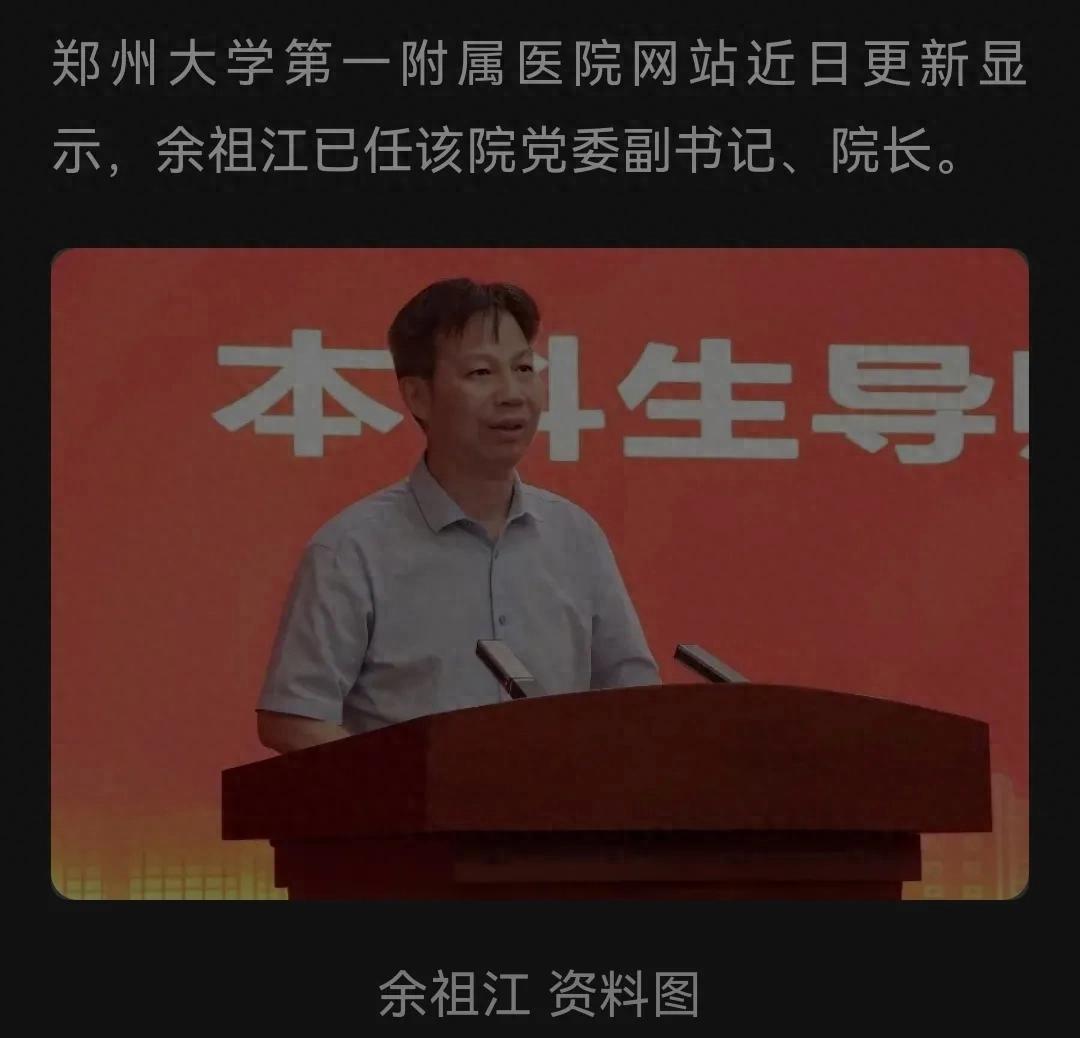 8月16日,郑州大学第一附属医院官网更新显示,余祖江教授正式出任该院党委副书记、院长。这位深耕传染病学二十余年的本土专家,接棒姜勇院长,执掌这艘拥有近百年历史的医疗“航母”。