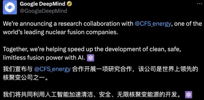 刚刚,Google DeepMind官宣与全球商业聚变能源公司巨头CFS合作,共同利用AI加速核聚变能源的开发。